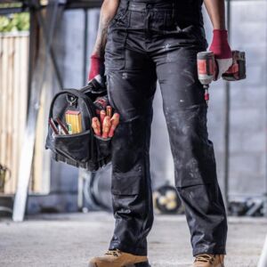 Hardwearing polycotton fabric, Multi pocket design with five pockets, Knee pad pockets, Part elasticated waistband, Triple stitched seams with reinforced crotch