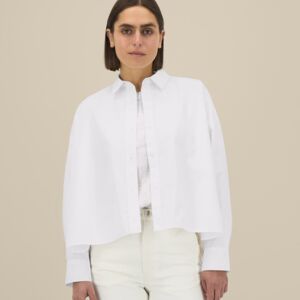 Women’s boxy shirt. Shirt collar with collar stand. Grown-on placket with single-needle topstitching on each side. Back yoke with twin-needle stitching. Forwarded shoulder seam with twin-needle stitching. Dropped shoulders. Square cuffs with single-button opening. Cuff placket with button opening. Shaped hem with side vents. Dipped back panel. Double pleats at cuff. Contains 100% certified organic cotton.